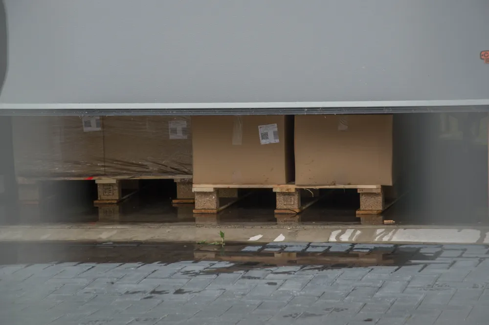 Ter afscherming stonden er een enorme aantal grote lege dozen op pallets voor gestapeld.