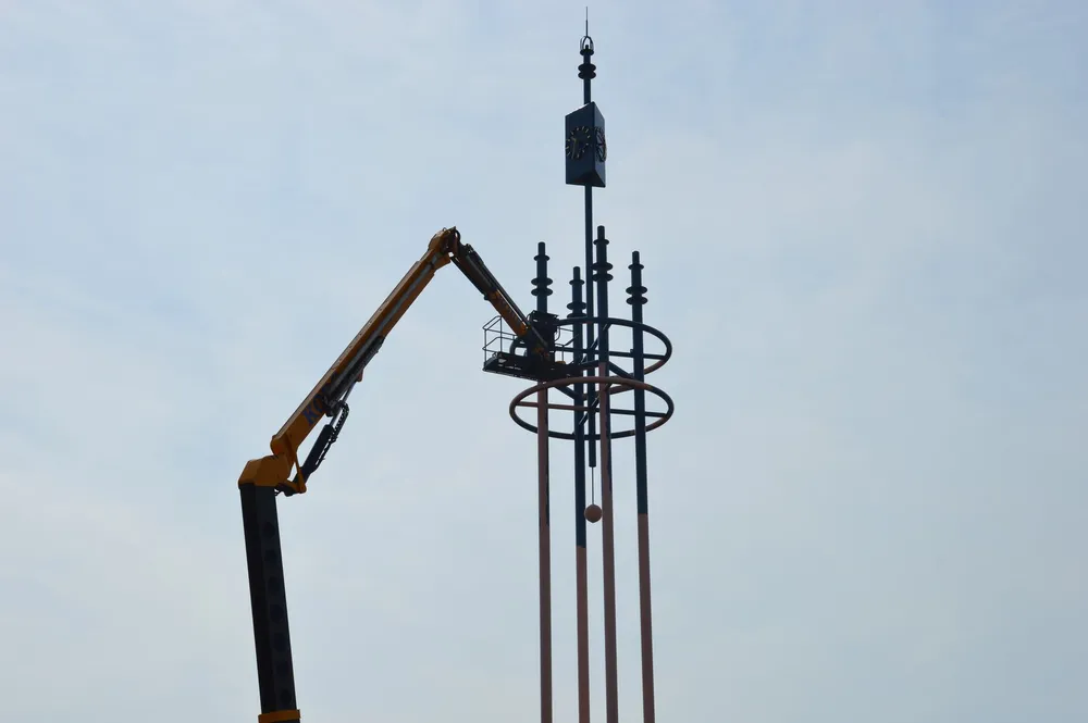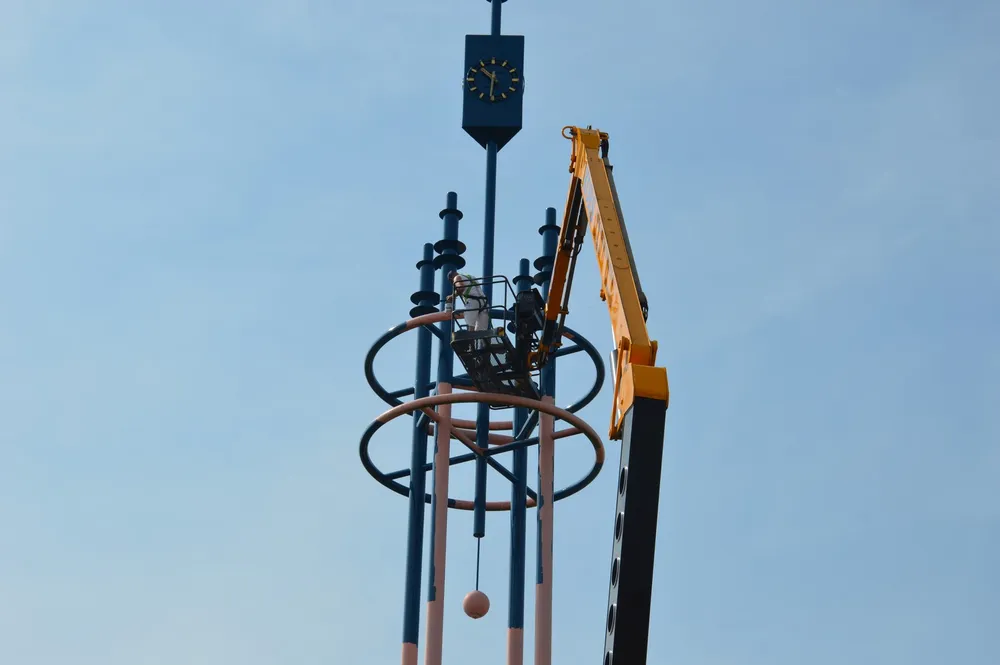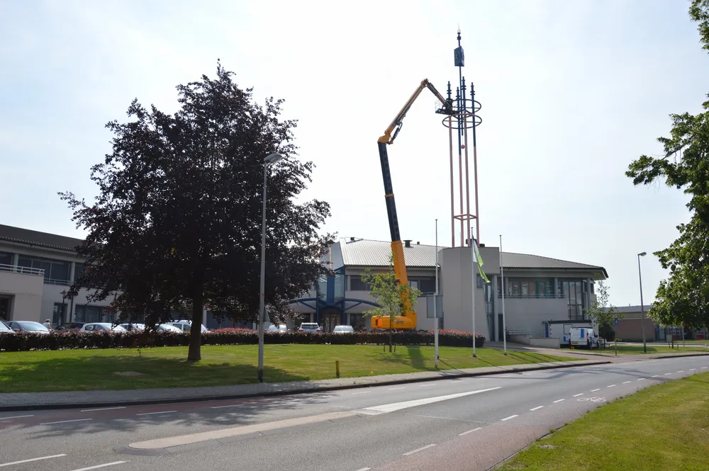 Schilders waren de afgelopen dagen bezig om de gehele toren in het donkerblauw te verven, de kleur van het gemeentelijke logo.