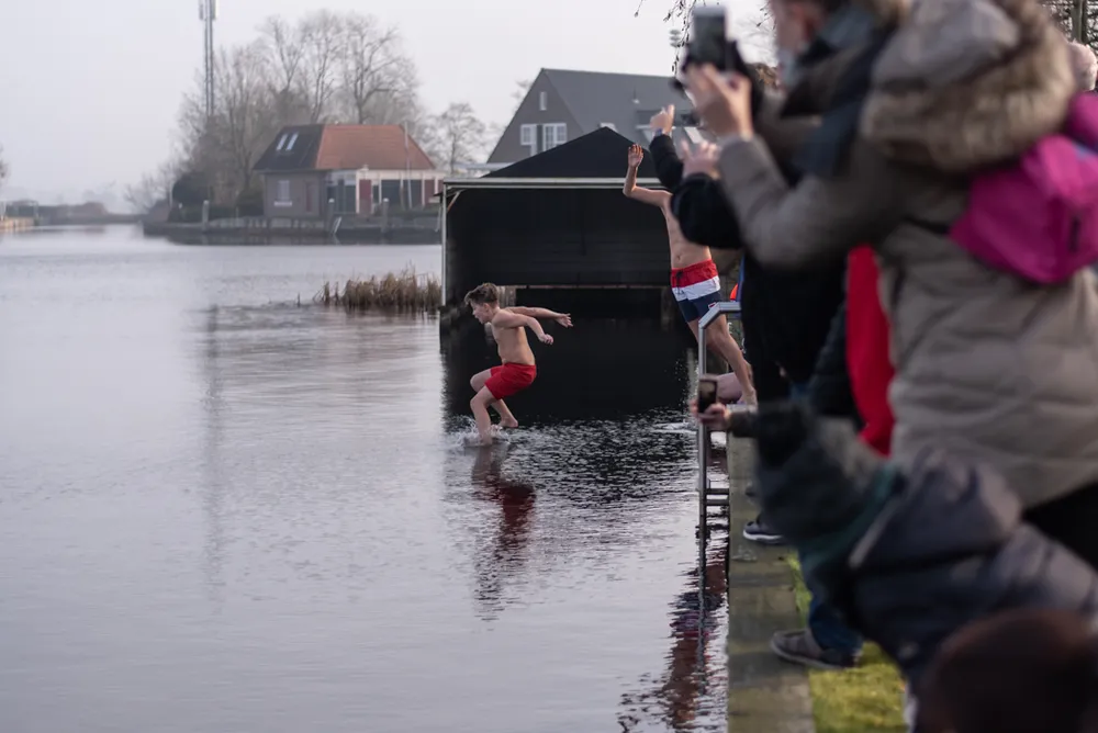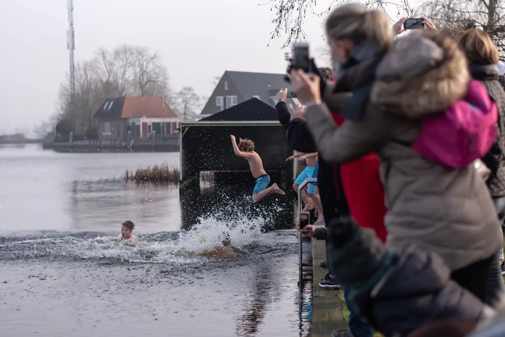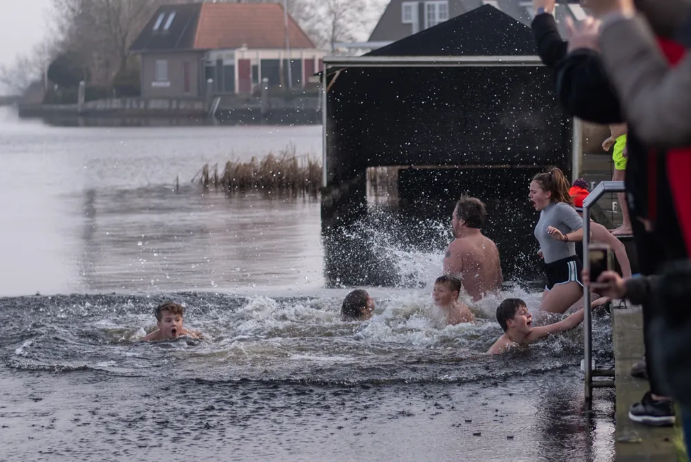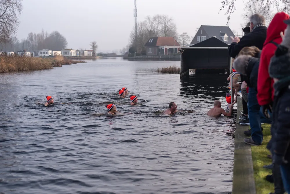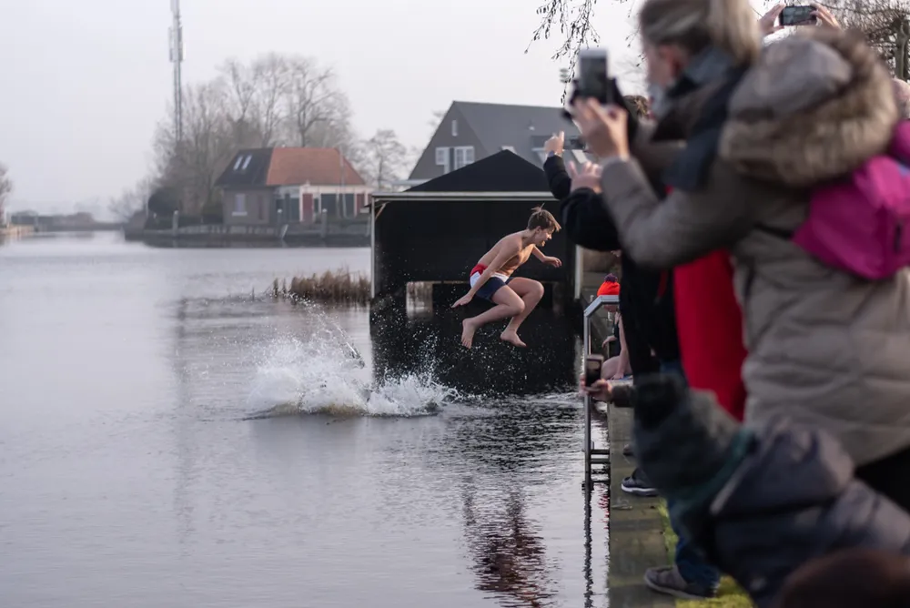 Om klokslag twaalf uur sprongen zo'n 15 bikkels het Noorderdiep in vanaf de Rietvink in Blokzijl voor de traditionele nieuwjaarsduik.