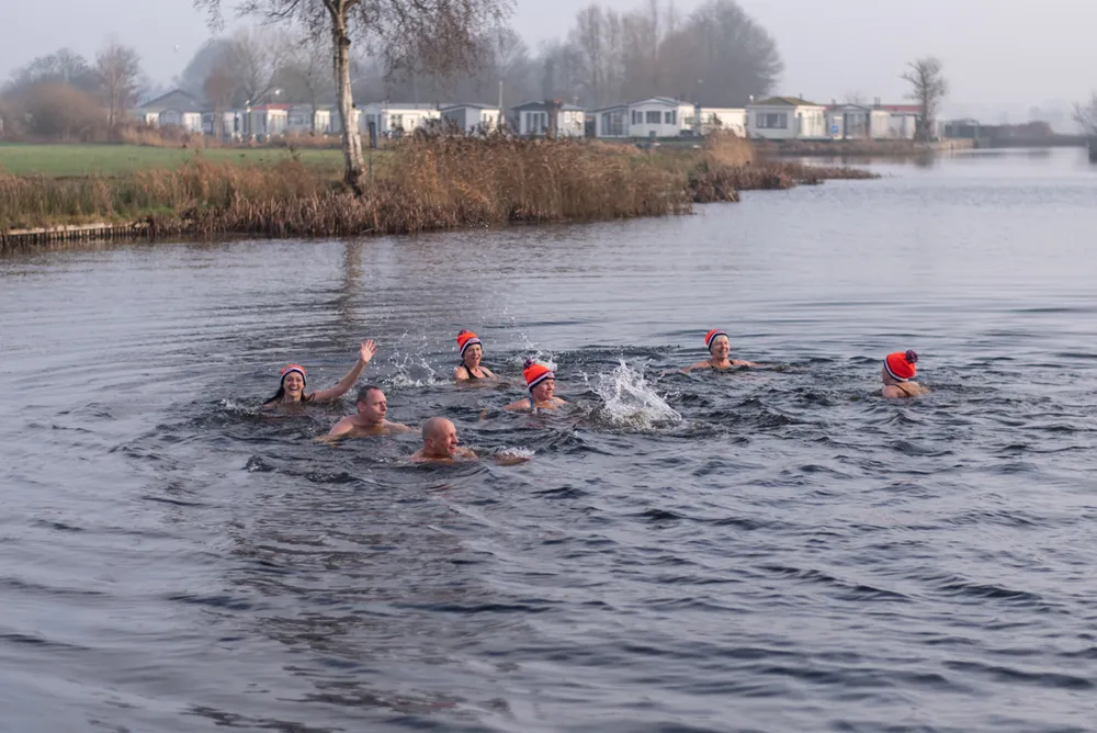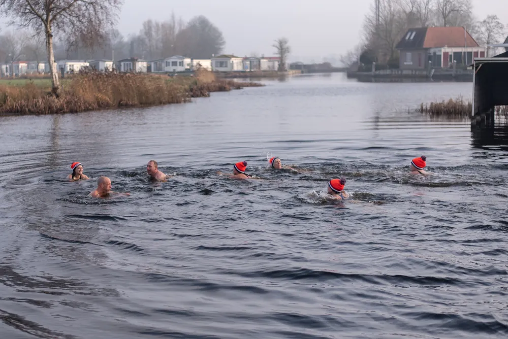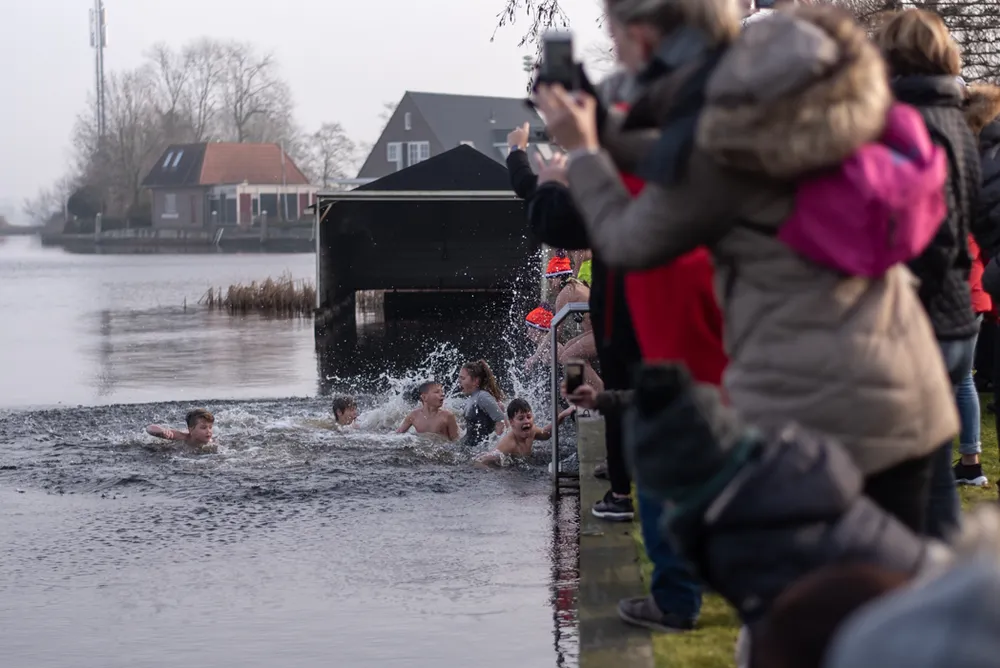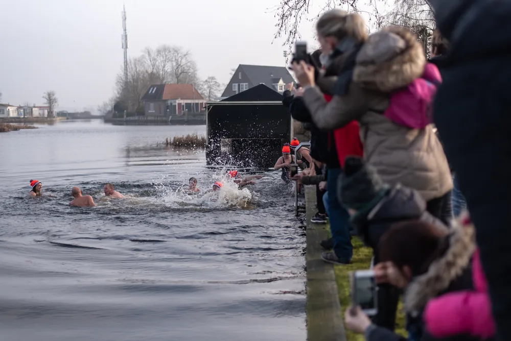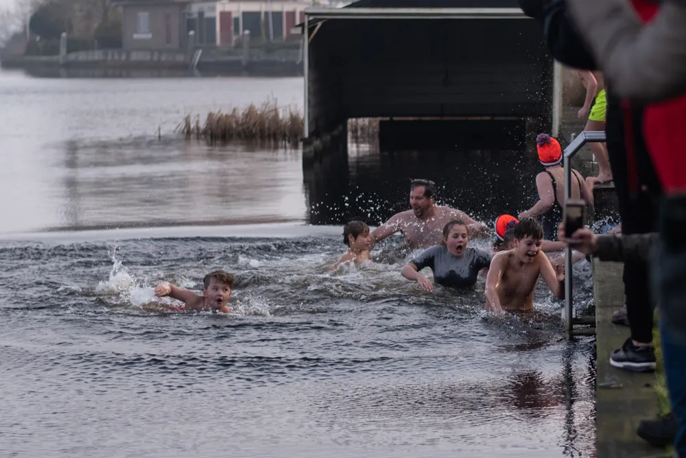 Om klokslag twaalf uur sprongen zo'n 15 bikkels het Noorderdiep in vanaf de Rietvink in Blokzijl voor de traditionele nieuwjaarsduik.